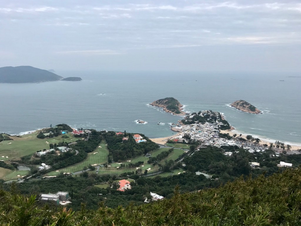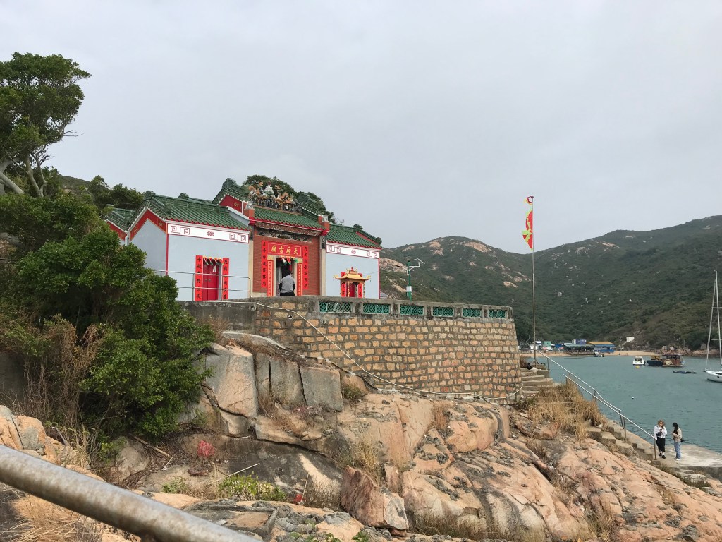 吃完午飯後,我們開始往西北方向的天后廟走去。香港現時保有102座天后廟,蒲台島上的這一座始建於18世紀。雖然已經快兩百年了,但維護地很好。這座天后廟建在風口上,但是三角旗的顏色還是保持鮮艷,廟裡柱子上的紅漆也很鮮亮,貢品和香火不斷。站在廟前的空地上,可以望到赤柱。